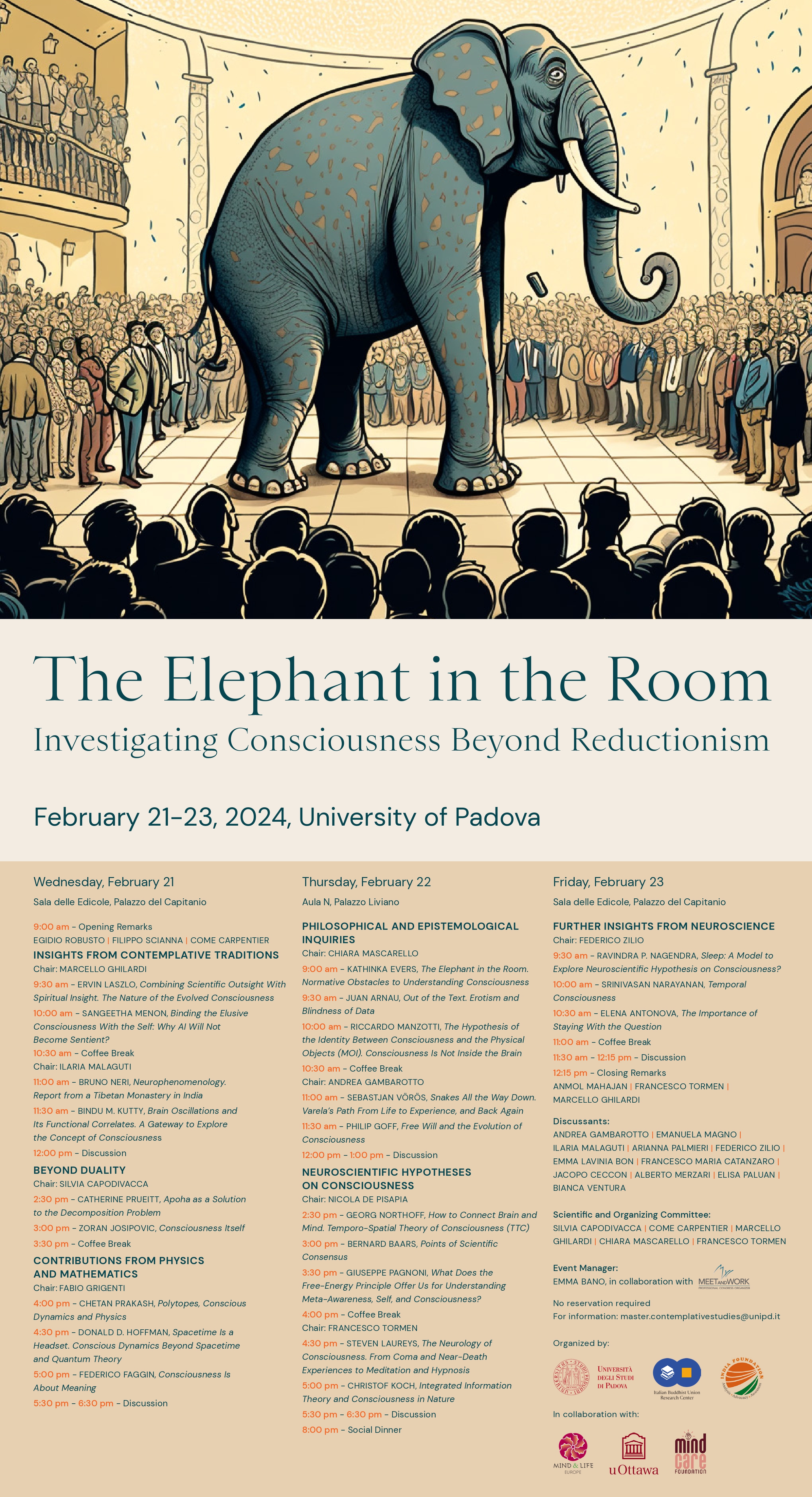 Sguardi interdisciplinari e non riduzionistici sulla natura della coscienzaIl convegno internazionale The Elephant in the Room, tenutosi dal 21 al 23 febbraio 2024 presso l’Università di Padova, ha rappresentato un’importante occasione di confronto sul tema della coscienza da una prospettiva interdisciplinare.